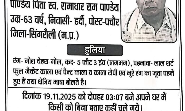 गुमशुदगी की सूचना नाम: श्री भुवनेश्वर प्रसाद पाण्डेय पिता: स्व. रामाधार राम पाण्डेय उम्र: 63 वर्ष पता: हर्दी, पोस्ट–पचौर, जिला–सिंगरौली…