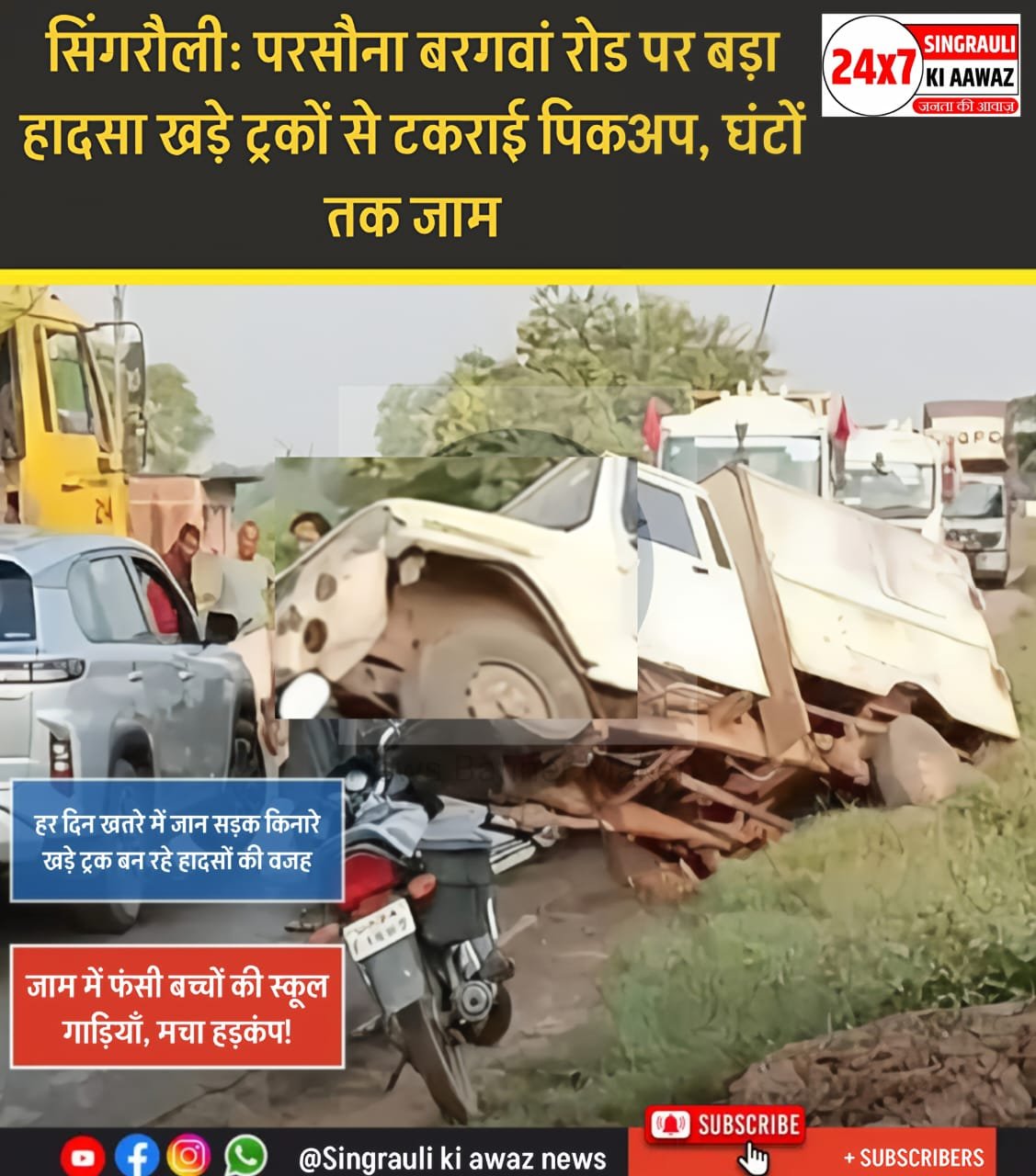 परसौना बरगवां रोड पर हादसा सड़क पर खड़े ट्रकों से टकराई पिकअप, घंटों तक जाम