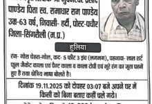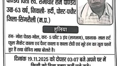 गुमशुदगी की सूचना नाम: श्री भुवनेश्वर प्रसाद पाण्डेय पिता: स्व. रामाधार राम पाण्डेय उम्र: 63 वर्ष पता: हर्दी, पोस्ट–पचौर, जिला–सिंगरौली…